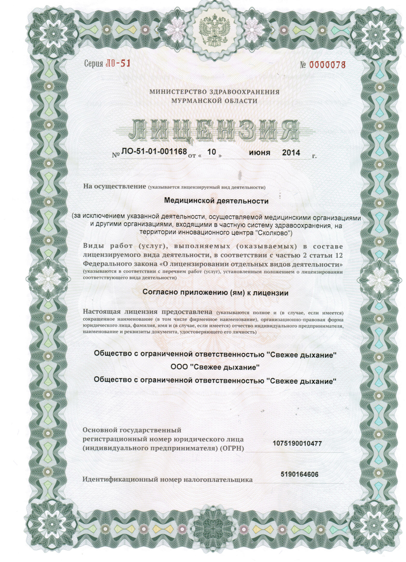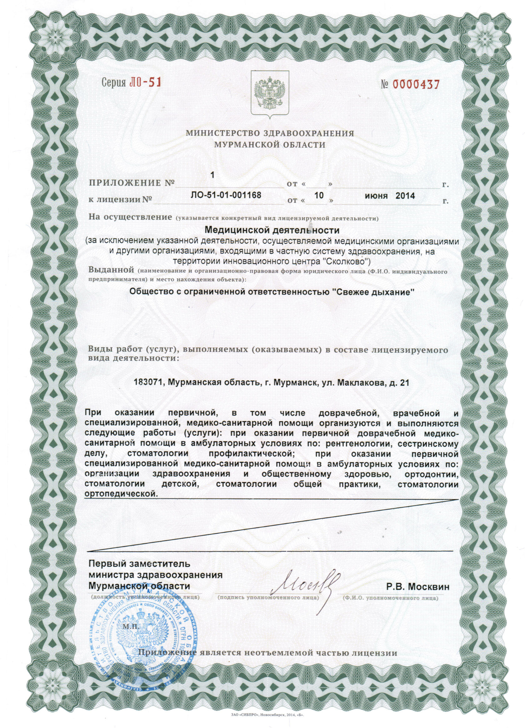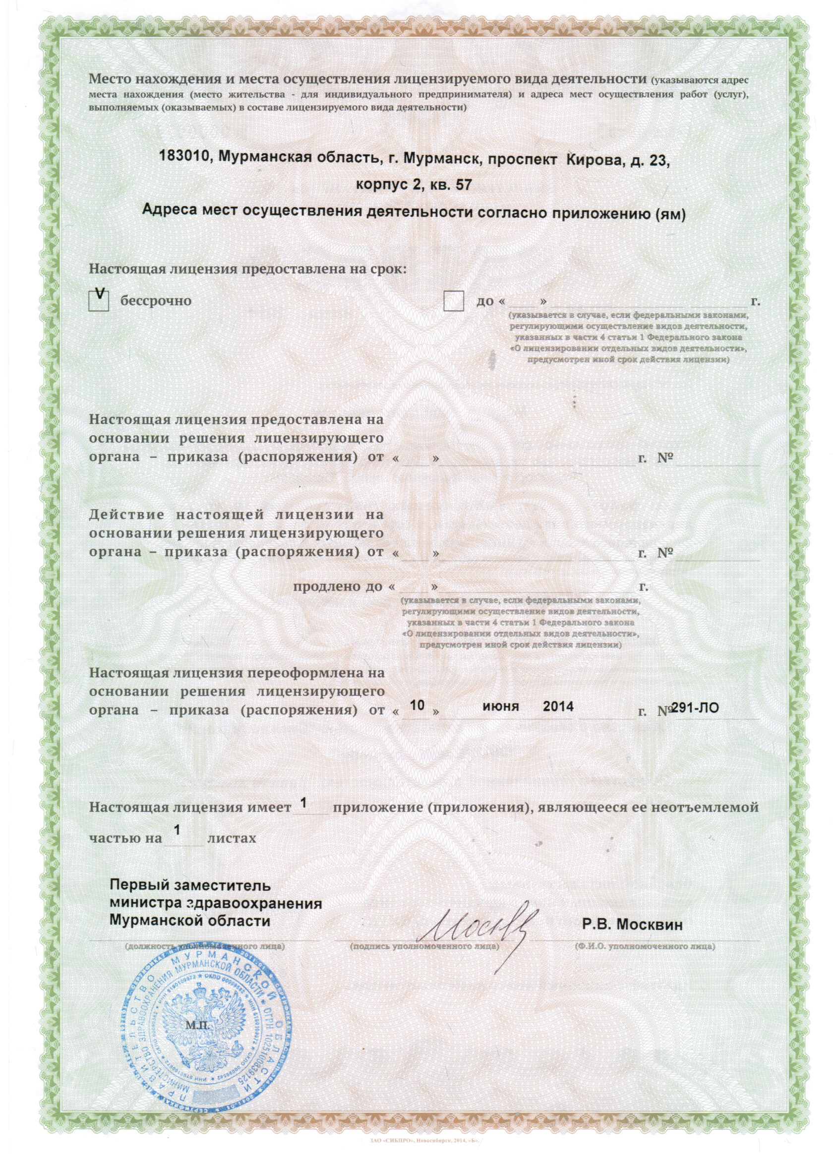 Платные медицинские услуги предоставляются на основании перечня работ (услуг), указанных в лицензии на осуществление медицинской деятельности, выданной в установленном порядке (Лицензия на право осуществления медицинской деятельности № ЛО-51−01−1 168 от 10 июня 2014 года выдана Министерством Здравоохранения Мурманской области).